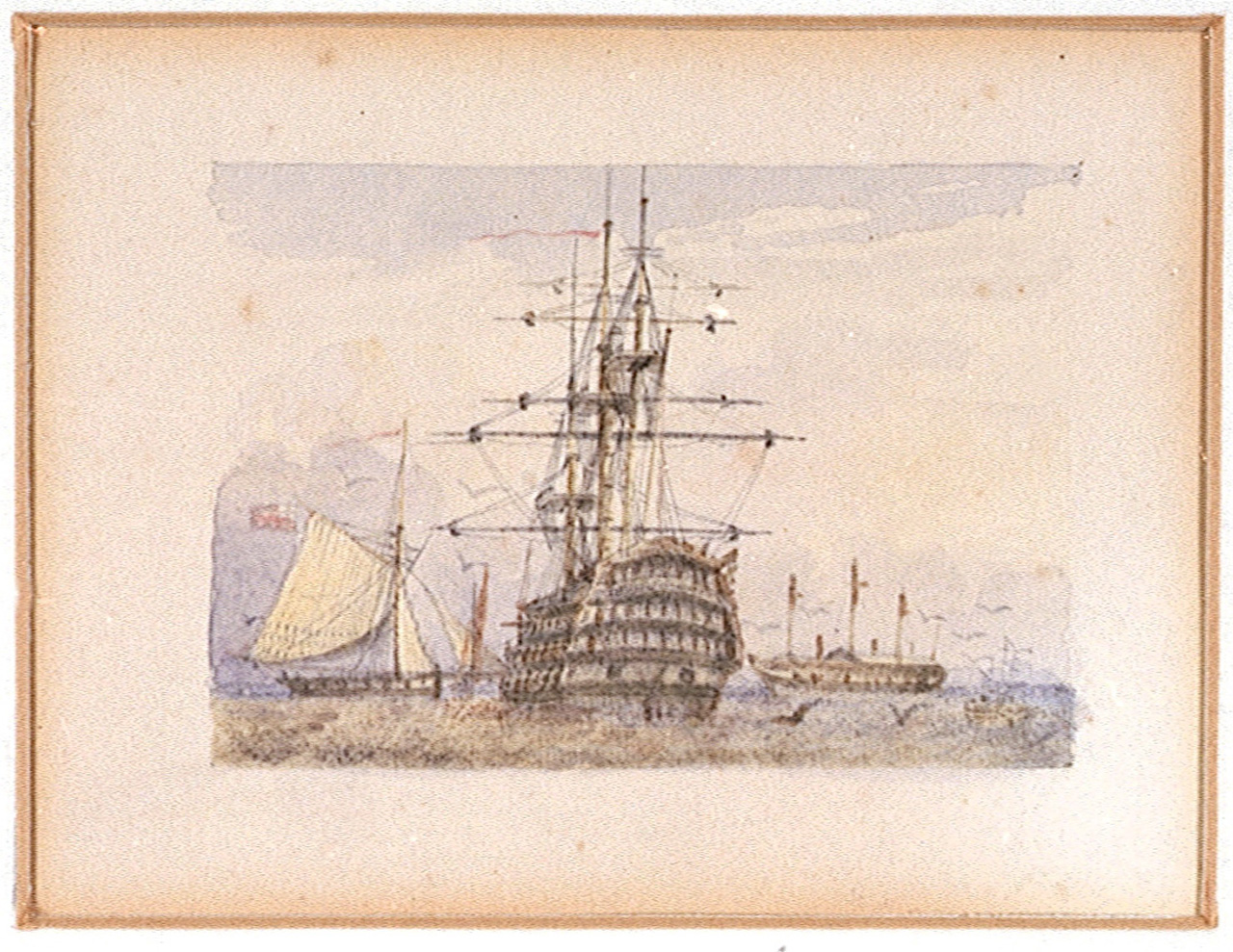 A three-decker and other shipping off Cawsand, 1833. Medium includes graphite.; Mounted with PAF6078-PAF6080.
