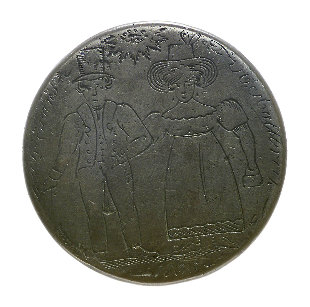 Engraved coin love token. Engraved coin love token. Obverse: A man (left) 'B. Evans' standing arm in arm with a woman (right) 'H. Hallbrick', the Heavenly Eye above. Below: '1833'. Reverse: A decorated scroll (centre) a baske