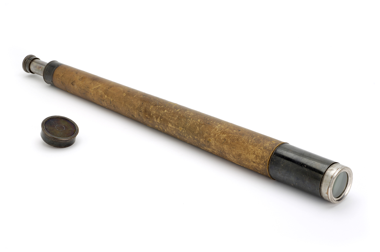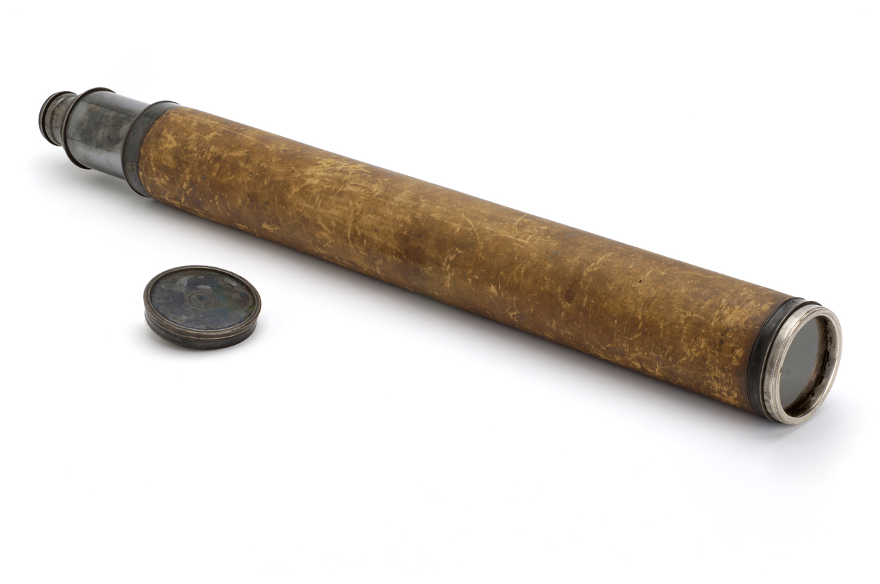 . This achromatic telescope is typical of those used on board ship for making general observations in the early 19th century. It has a leather-covered tapering barrel and a single silvered-brass draw tube, on which is engraved the maker's name: '