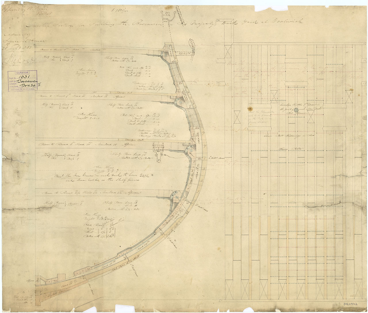 Sovereign of the Seas (not built?). Scale: 1:48. Plan showing the body plan, sheer lines, and longitudinal half-breadth (proposed?) for the Sovereign of the Seas (not built?), a 130-gun First Rate, three-decker. The vessel represented is larger than the R