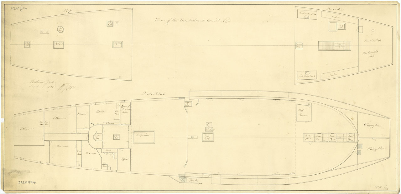 'Cumberland' (1807). Scale: 1:48. Plan showing the poop, quarterdeck, and forecastle for 'Cumberland' (1807), a 74-gun Third Rate, two-decker as fitted as a Convict Ship. The plan pre-dates her being renamed 'Fortitude' in No