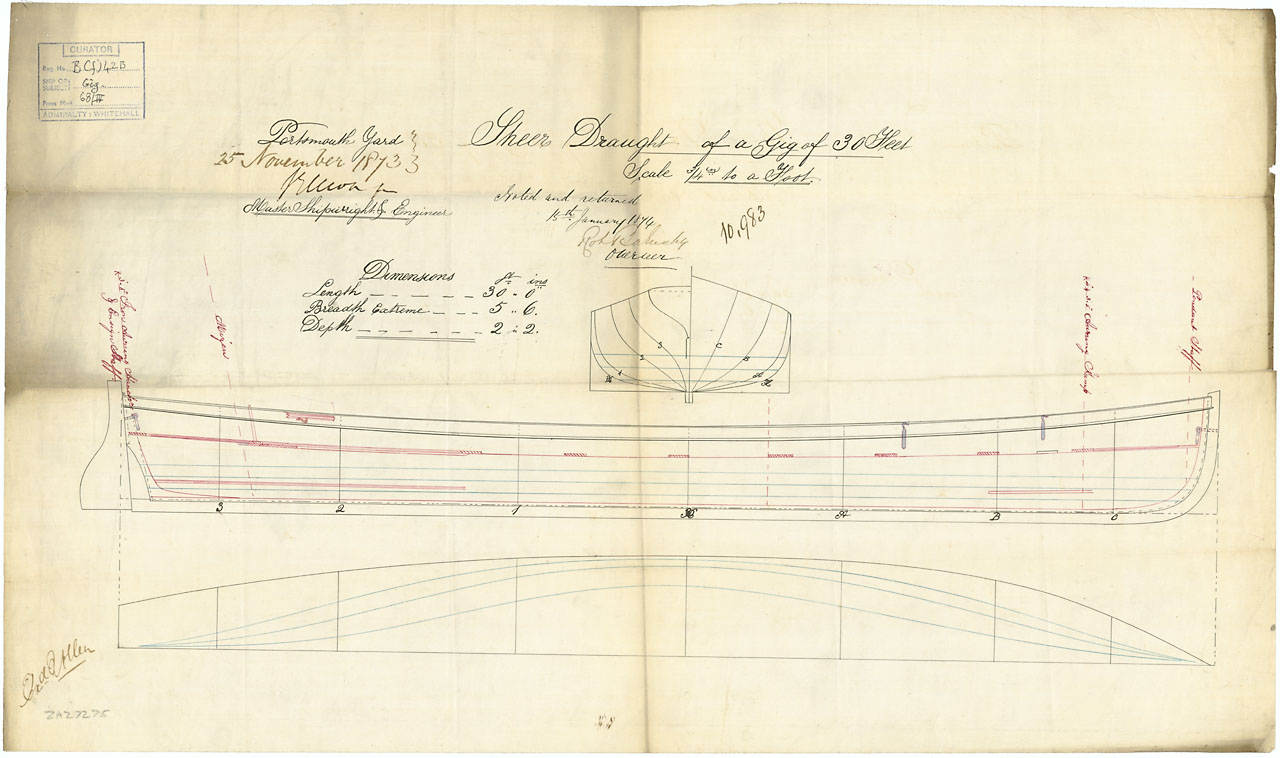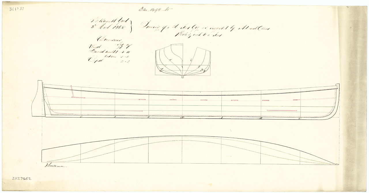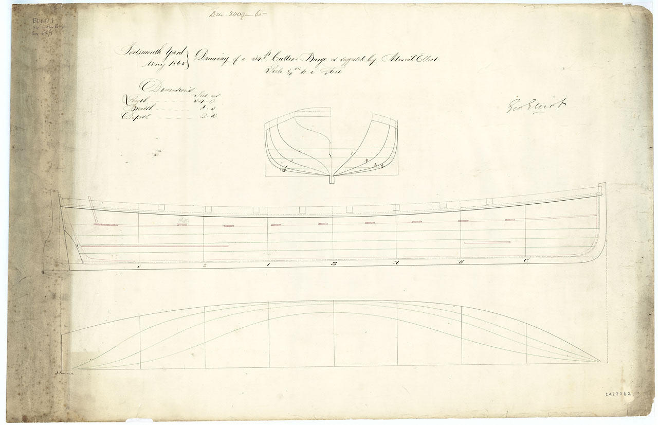 30 ft Cutter. Scale: 1:16. Plan showing the body plan, sheer lines with inboard detail, and longitudinal half-breadth for a 12-oared 30 ft Cutter, as suggested by Admiral Elliot. Signed George Elliot [Rear Admiral (seniority 24 February 1858), Superinte