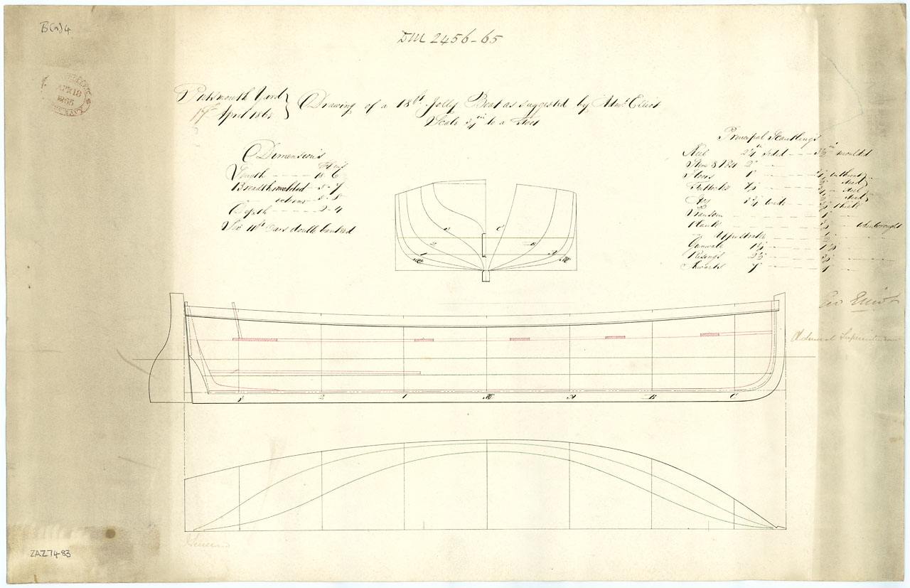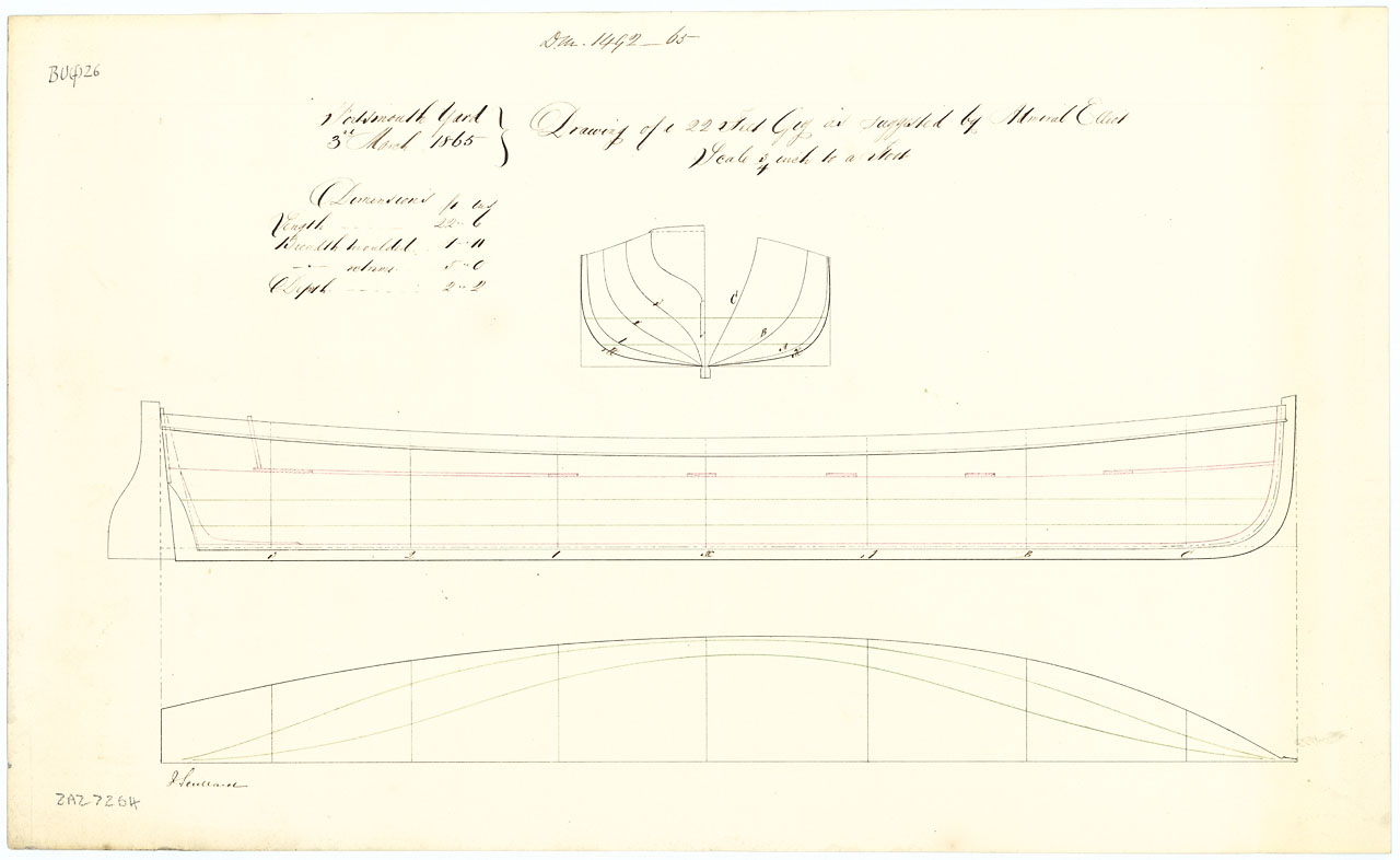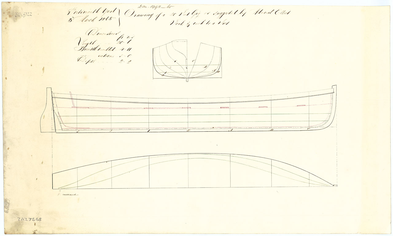 25 ft lifeboat Cutter. Scale: 1:16. Plan showing the body plan with buoyancy tank, sheer lines with inboard detail, deck plan with buoyancy tanks for a 25 ft lifeboat Cutter, prposed by Admiral Elliott. Annotation on reverse states in red ink: "Not