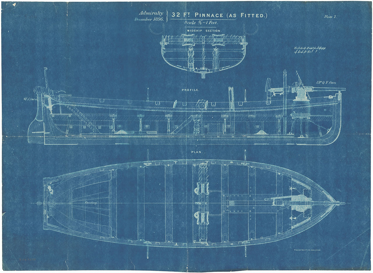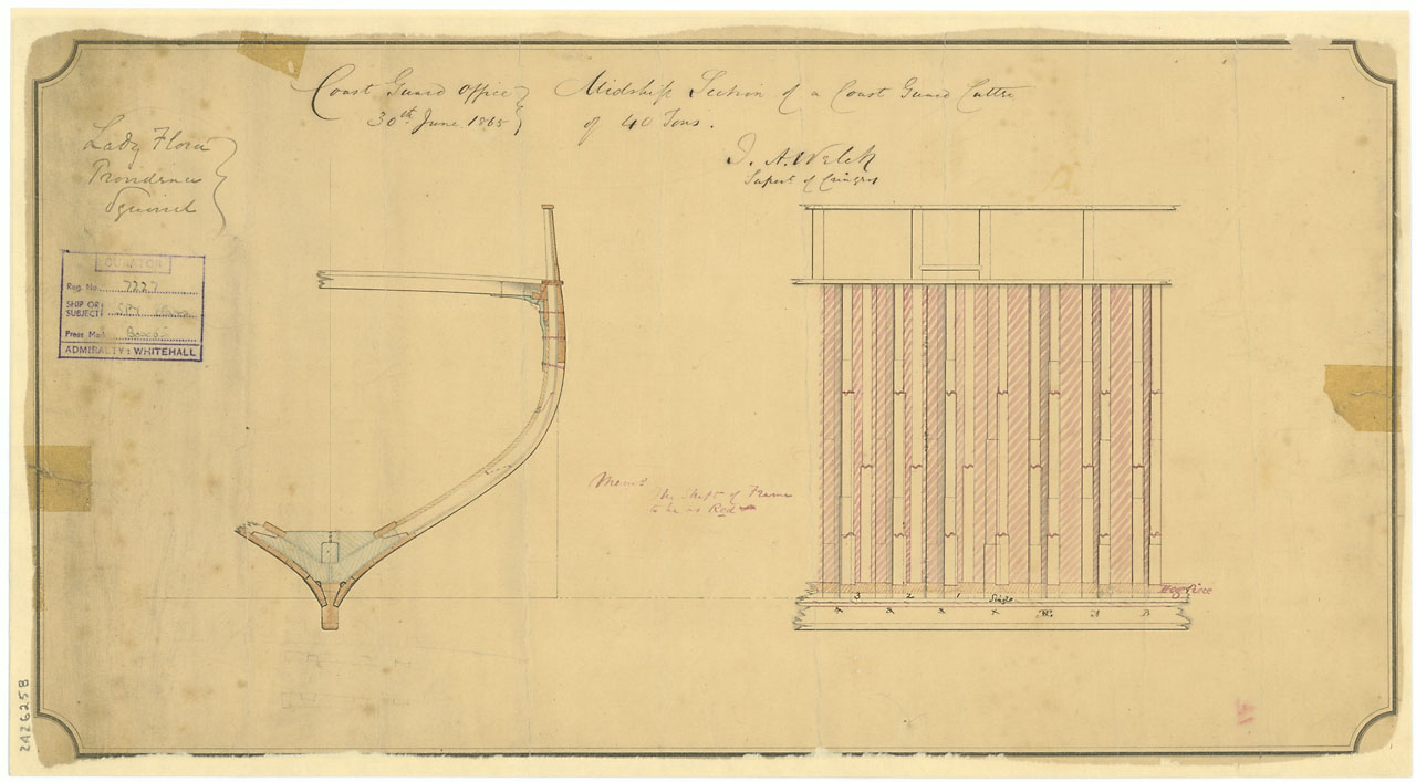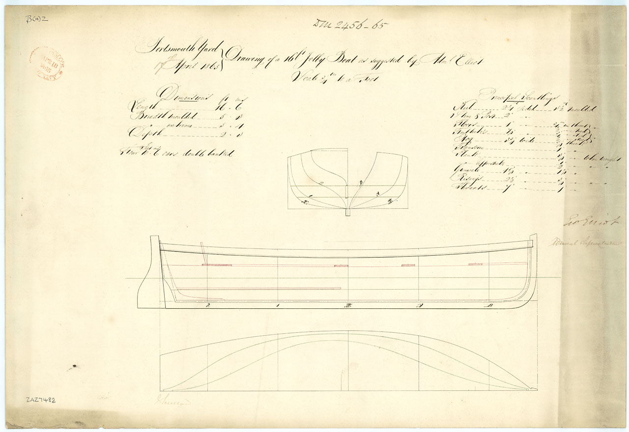 25 ft lifeboat Cutter. Scale: 1:16. Plan showing the body plan with buoyancy tank, sheer lines with inboard detail, deck plan with buoyancy tanks for a 25 ft lifeboat Cutter, prposed by Admiral Elliott. Annotation on reverse states in red ink: "Not