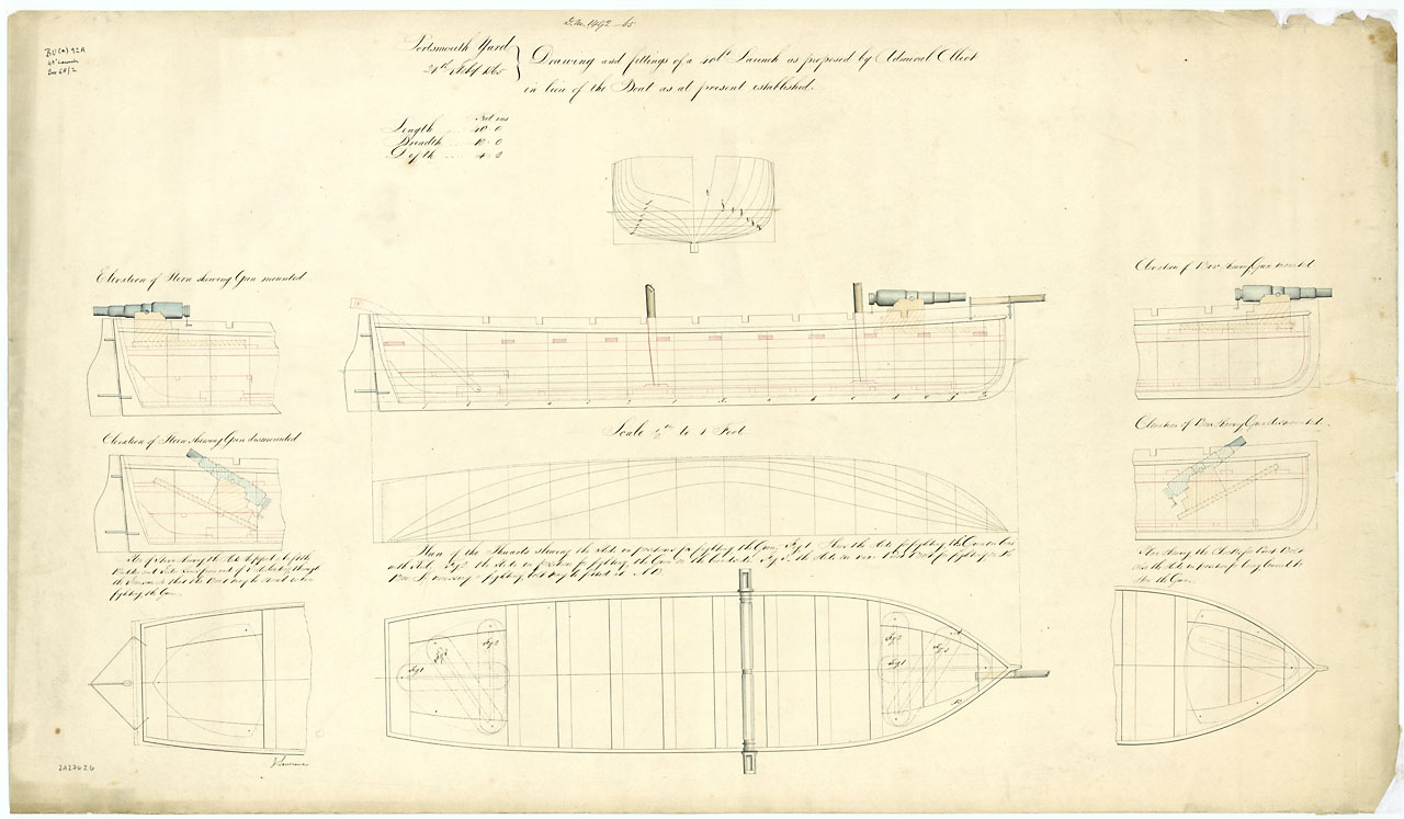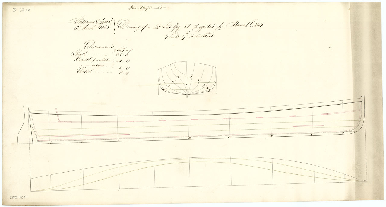 28 ft Cutter. Scale: 1:16. Plan showing the body plan, sheer lines with inboard detail, and longitudinal half-breadth for a 10-oared 28 ft Cutter Barge, as suggested by Admiral Elliot. Signed George Elliot [Rear Admiral (seniority 24 February 1858), Sup