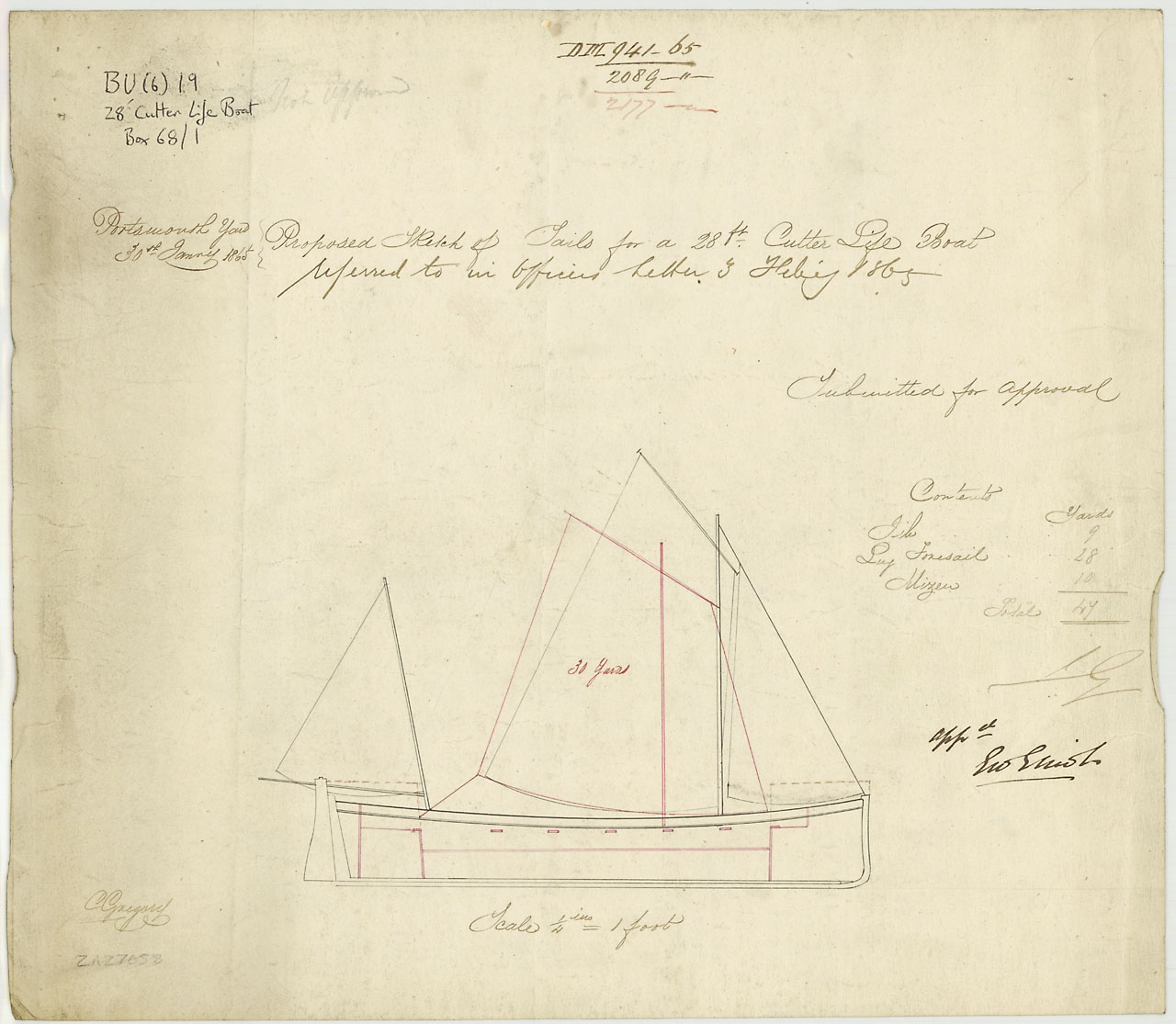 25 ft lifeboat Cutter. Scale: 1:48. Plan showing the sail plan for a two-masted 25 ft lifeboat Cutter proposed by the Portsmouth Officers to be adopted as an established rig.