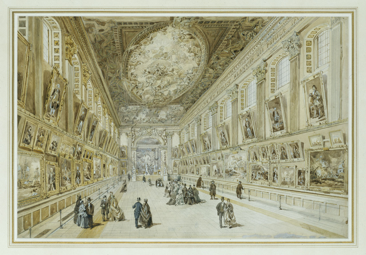 View of the Naval Gallery in the Painted Hall, Greenwich Hospital, in 1865. This fine perspective drawing appears to have been the basis of a wood-engraving in the 'Illustrated London News' for 22 April 1865, in an article advocating a visit to