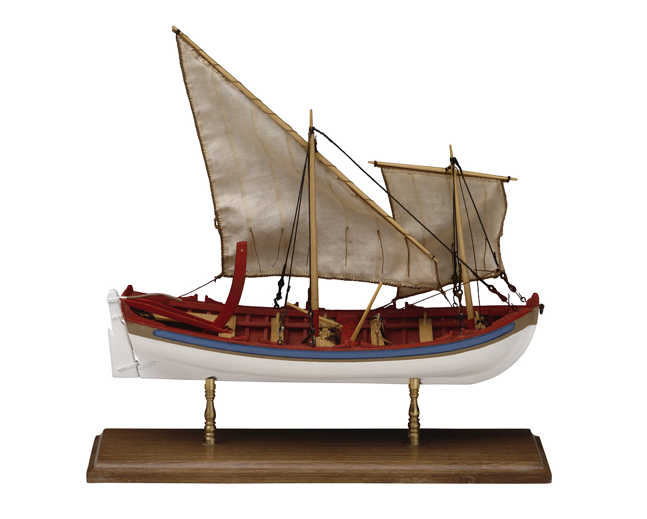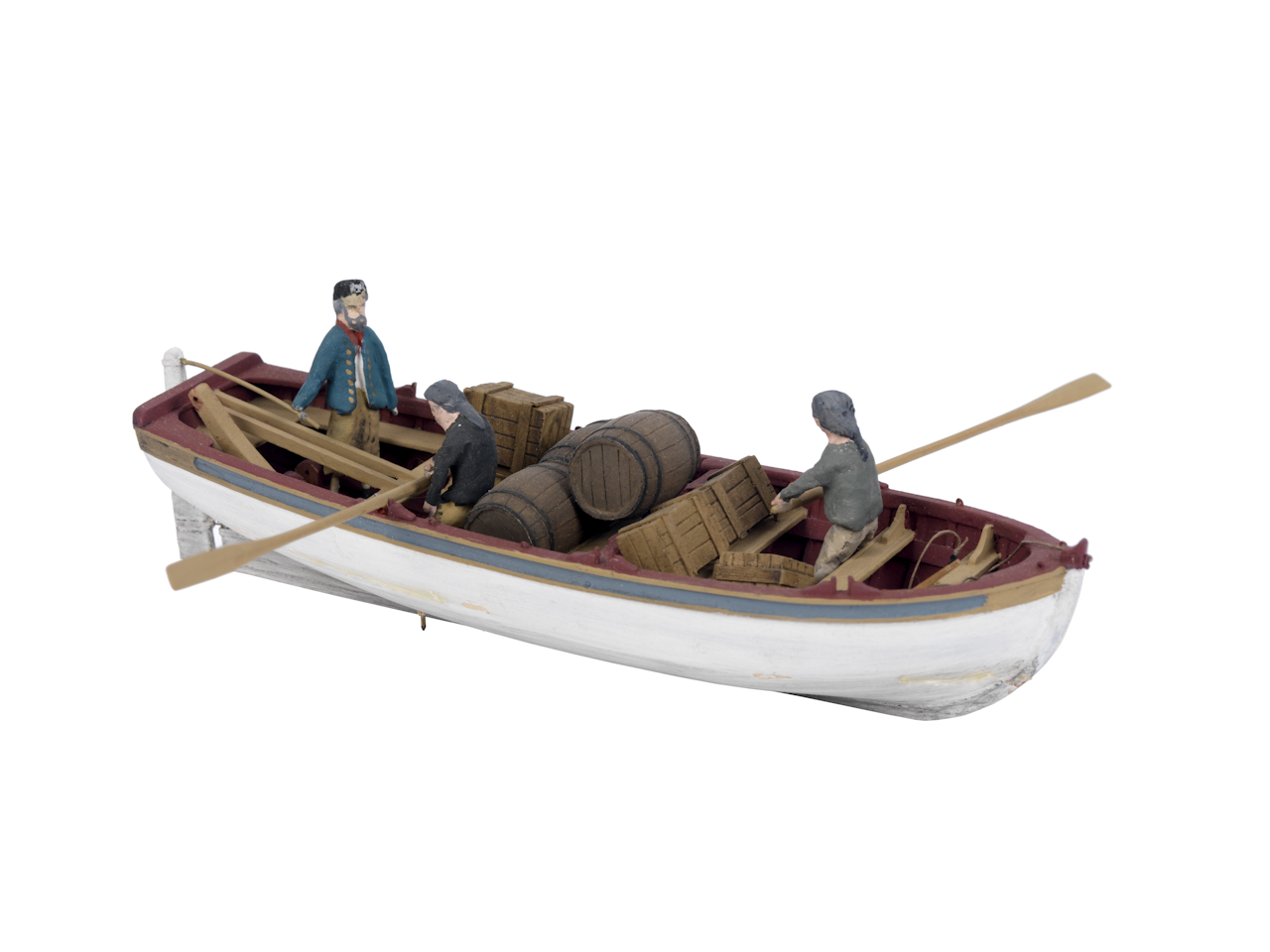 Service vessel; Jolly boat. Scale: 1:48. A modern exhibition model of the 16-foot jolly boat as issued to HM Transport ‘Bounty’ (1784) and included as part of a larger diorama showing the ship alongside a quay loading supplies for a upcoming v