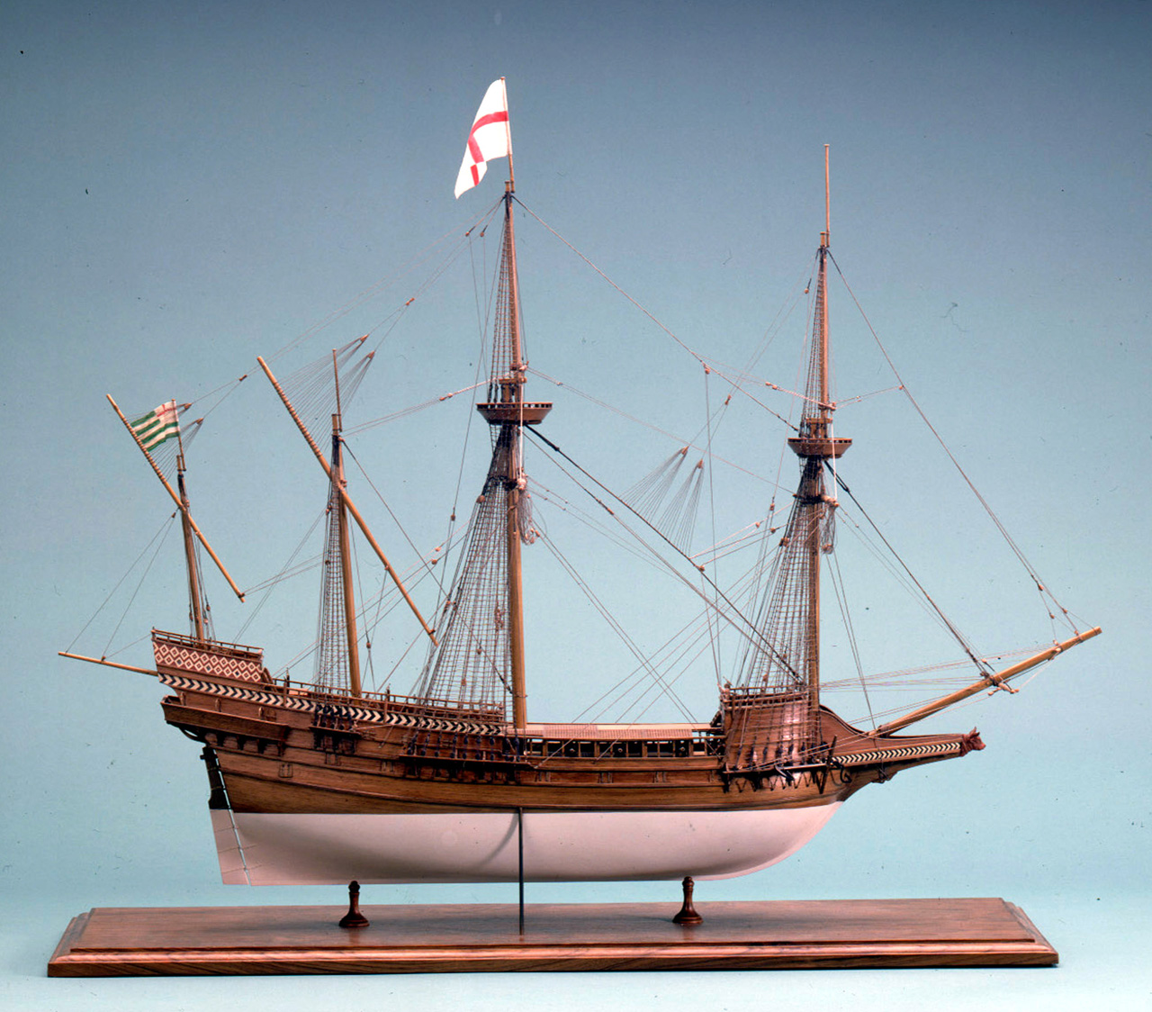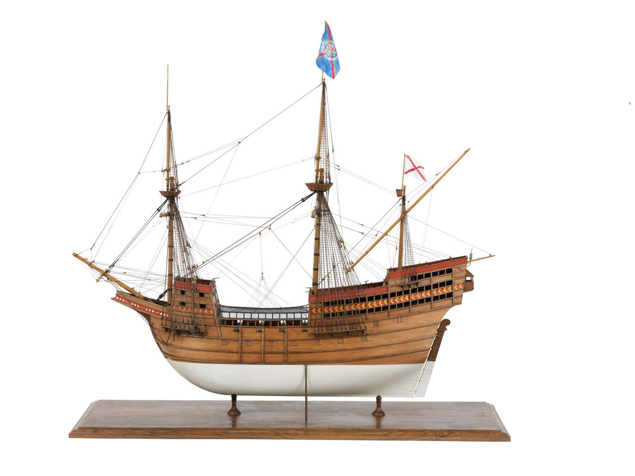 Warship1588); Galleon; English. Scale: 1:96. A full hull model of an English galleon (circa 1588), built in the solid and plank on frame. Model is decked, equipped and fully rigged, including details such as deck gratings, stern and bulwark decoration as