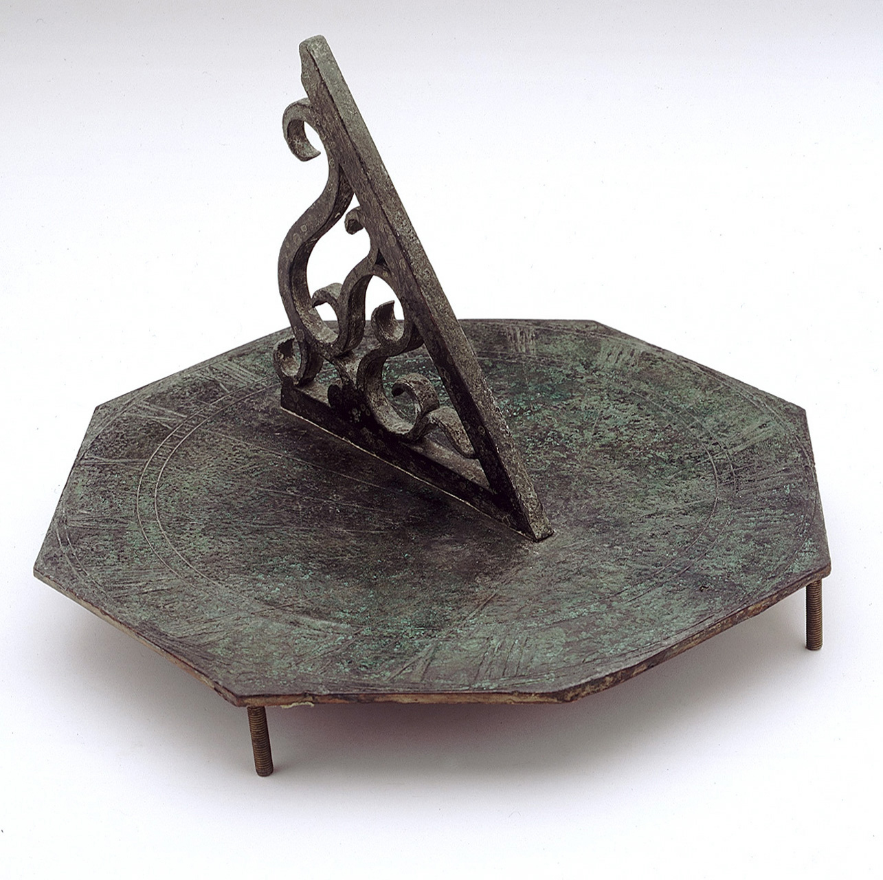 . Imitation horizontal pedestal dial for latitude 54° North. The dial comprises an octagonal base-plate resting on four screw legs. It has an hour-circle, inside which is a pierced gnomon decorated with scrollwork. The dial is painted to show almost c
