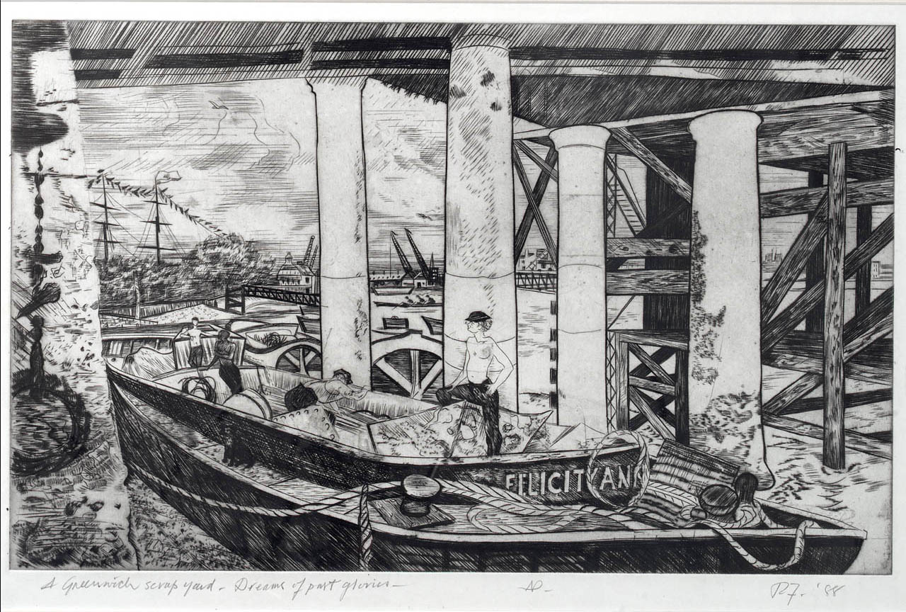 A Greenwich Scrapyard. Dreams of Past Glories. A view westward from under the coaling jetty piers of Greenwich Power Station towards the 'Cutty Sark' and the Greenwich Foot Tunnel cupola. The lighter in the foreground, 'Felicity Ann',