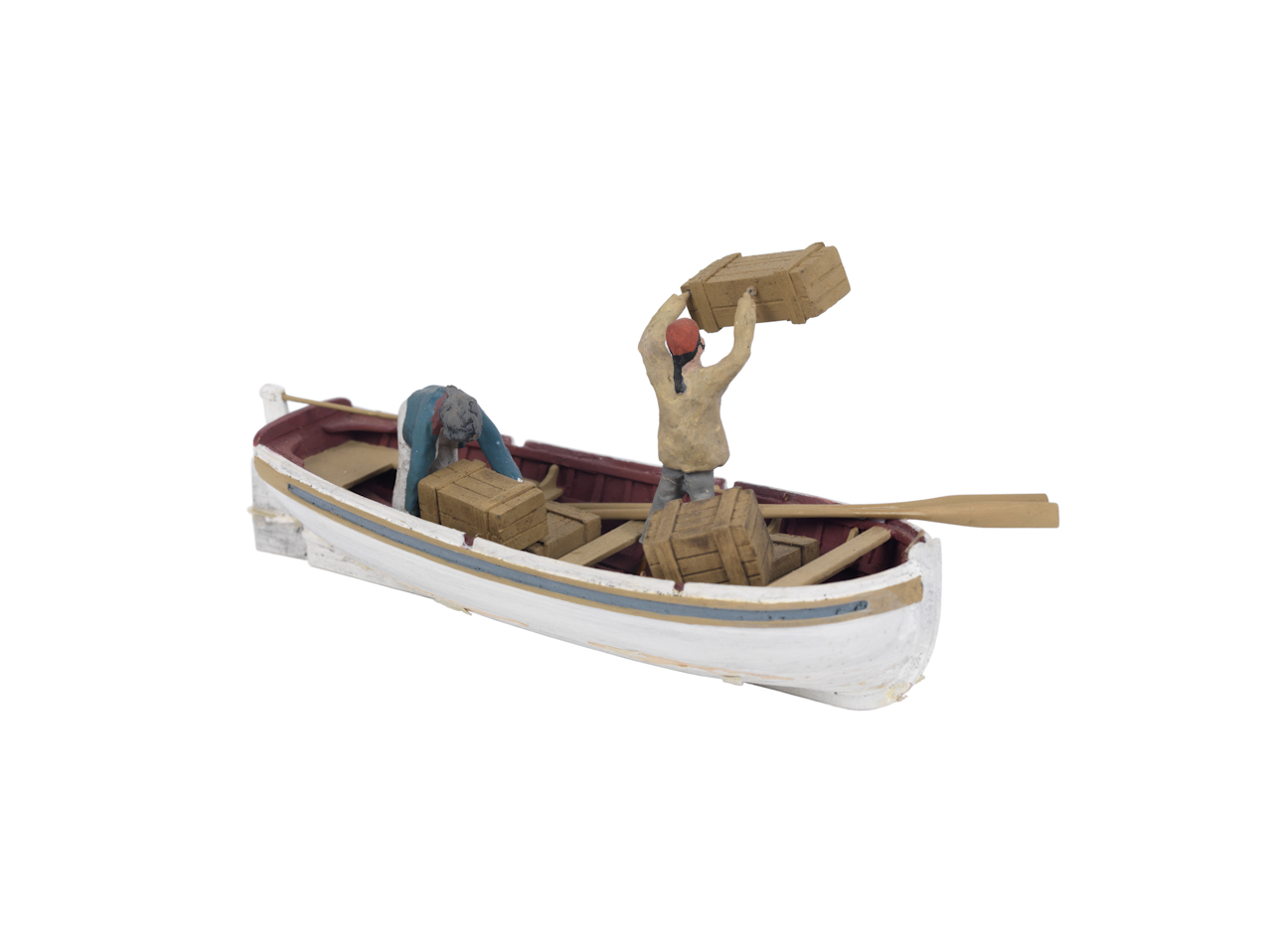 Service vessel; Launch. Scale: 1:48. A modern exhibition model of the 23-foot launch as issued to HM Transport ‘Bounty’ (1784) and included as part of a larger diorama showing the ship alongside a quay loading supplies for a upcoming voyage. T