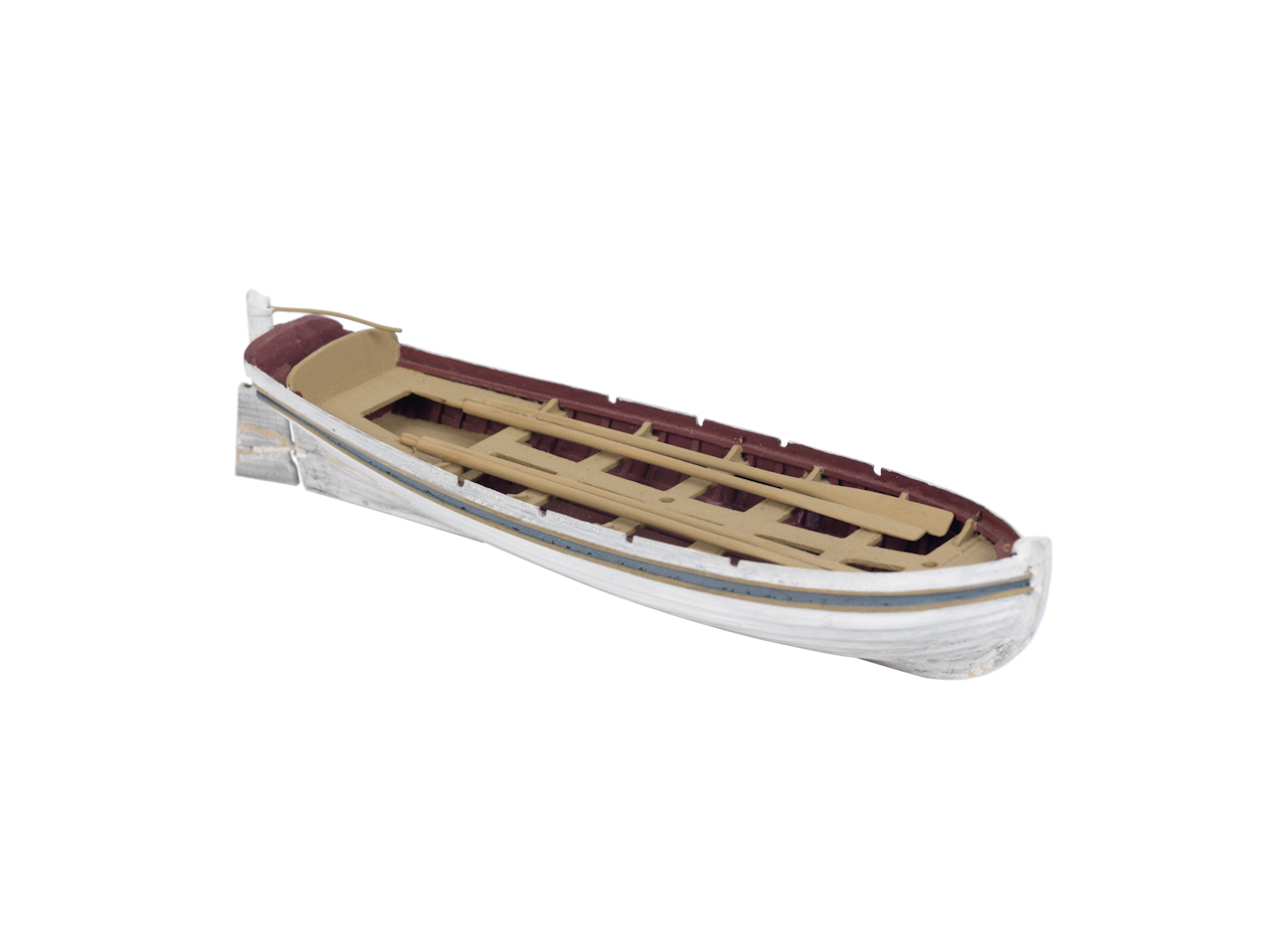 Service vessel; Launch. Scale: 1:48. A modern exhibition model of the 18-foot cutter as issued to HM Transport ‘Bounty’ (1784) and included as part of a larger diorama showing the ship alongside a quay loading supplies for a upcoming voyage. T