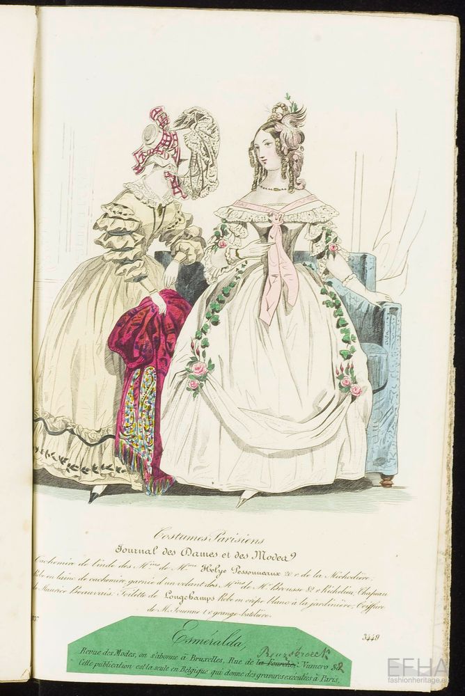 Modeprent (in kleur) uit 'Esméralda : revue littéraire, artistique et fashionable (modes de Paris)' 1837-02-01