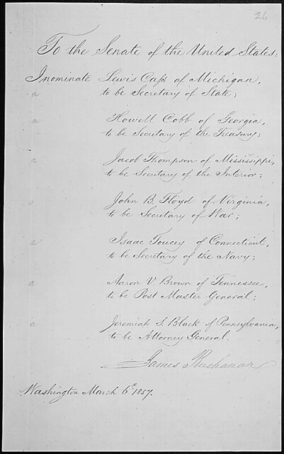 Message of President James Buchanan nominating his cabinet, 03/06/1857