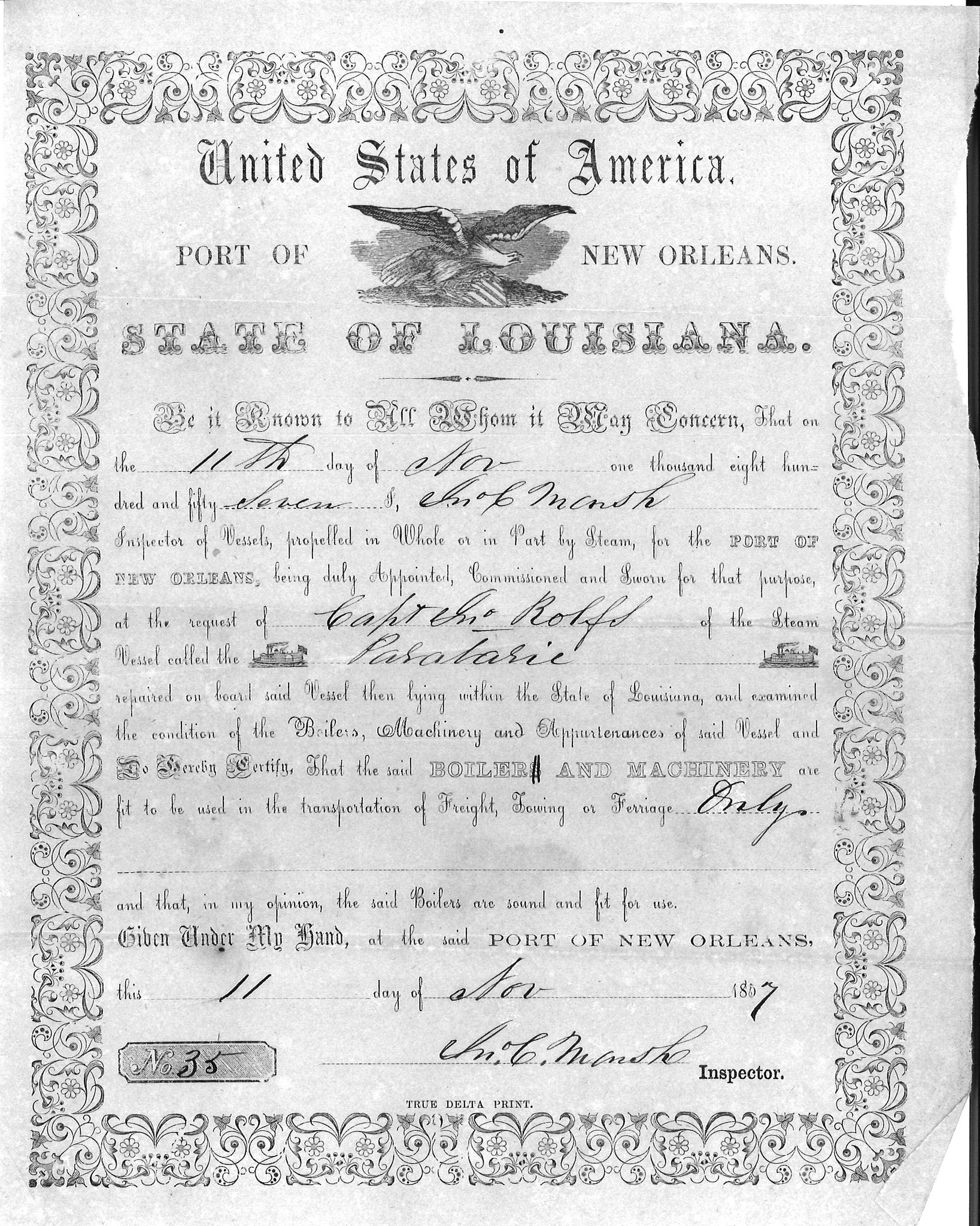 Engineers' and Pilots' Licenses from the St. Louis Custom House, 01/08/1857 (Reverse)