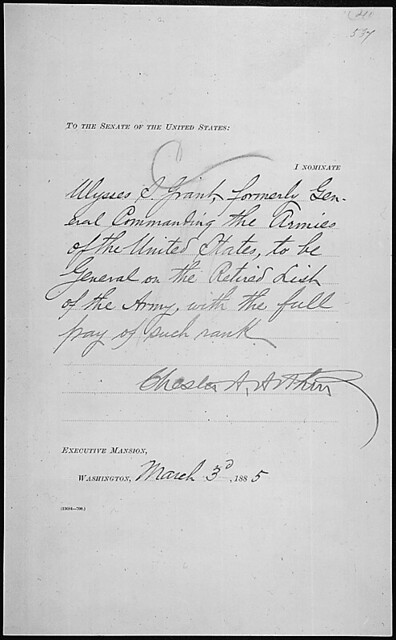 Message of President Chester A. Arthur nominating Ulysses S. Grant to be General on the retired list of the Army, 03/03/1885
