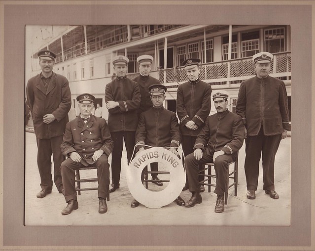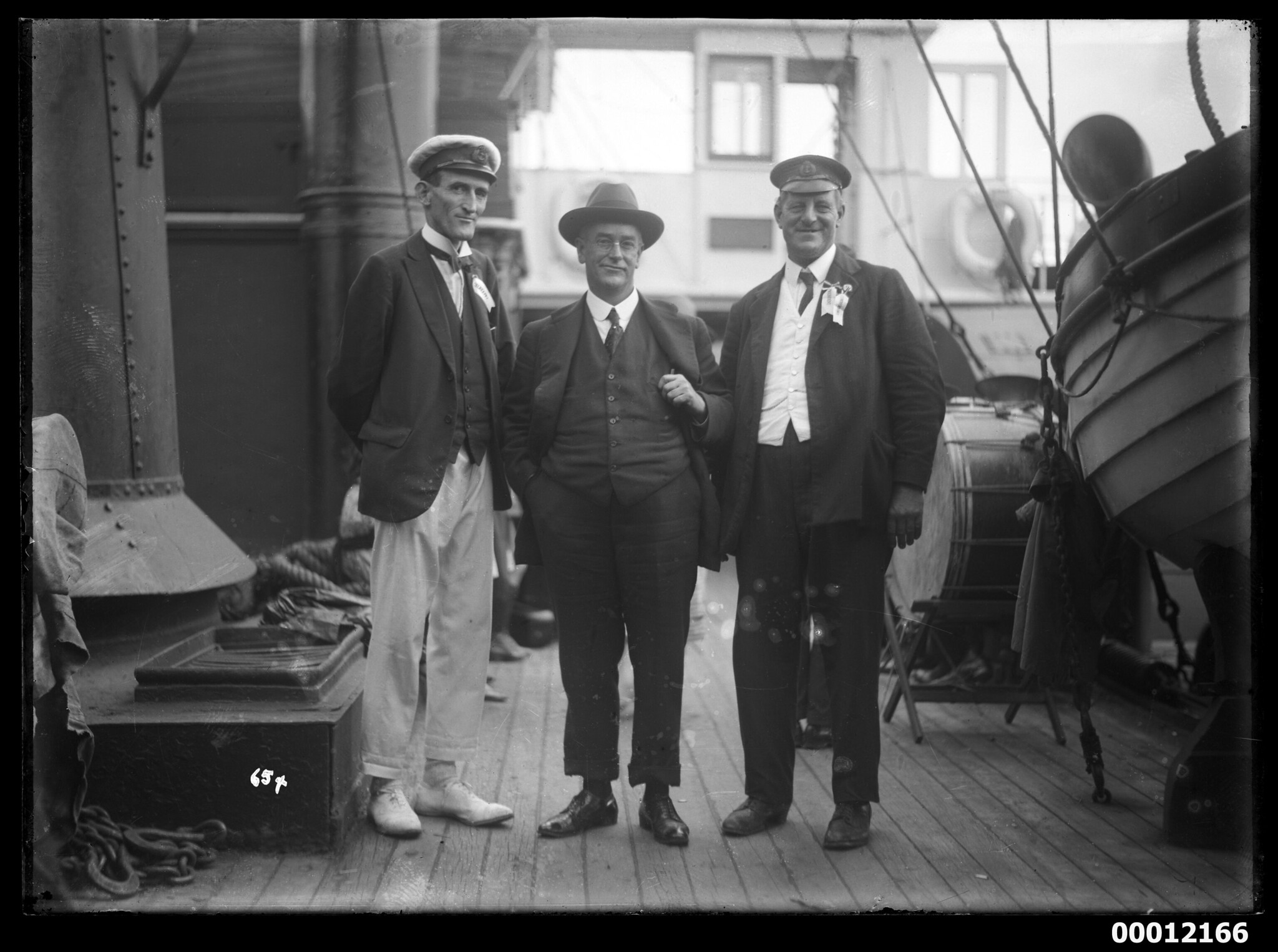 Mr John Roche (left), Mr F. J. S. Young (right) and an unidentified man onboard NAMOI, Sydney Harbour
