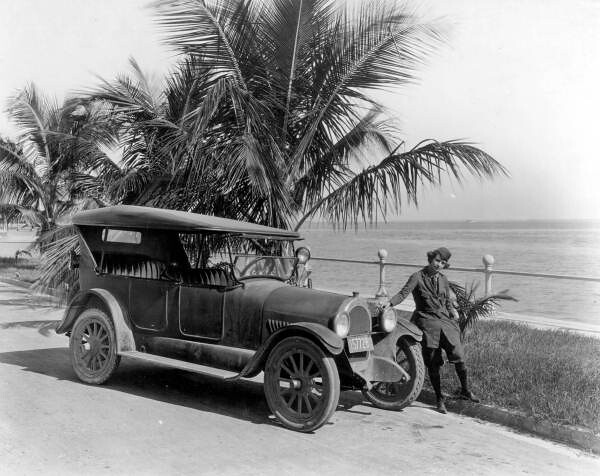 Unidentified woman standing next to an automobile parked along the bay: Coral Gables, Florida