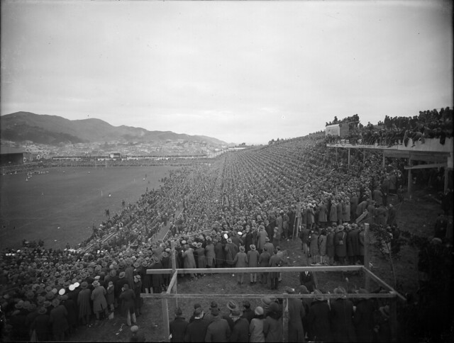 Crowd watching a rugby match at Athletic Park, Wellington, ca 1930