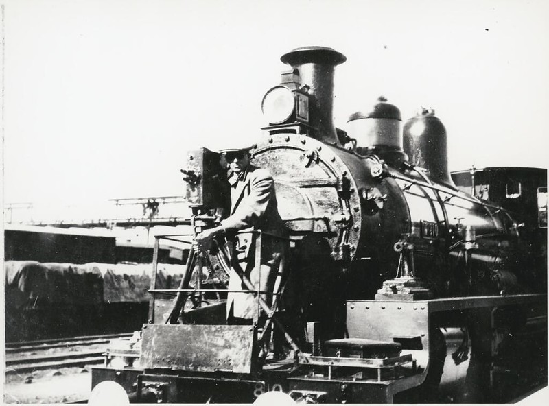 Man with a camera mounted on the front of a train, Queensland, circa 1930