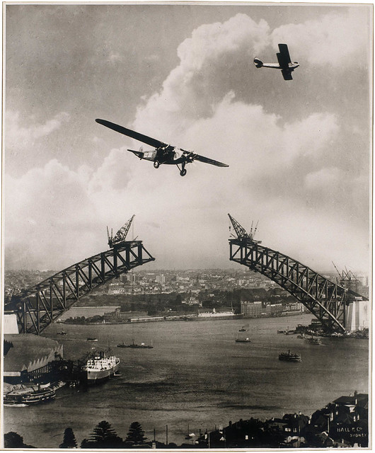 Sydney Harbour Bridge during construction, 1930, with two aeroplanes, Charles Ulm's "Southern Sun" & a Gypsy Moth / photomontage by Edward Searl