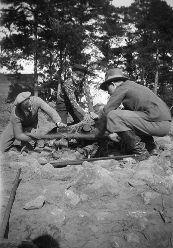 Removal of stump at archaeological excavation in Nälsta, Uppland, Sweden
