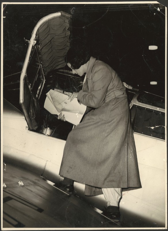 Portrait of Jean Batten studying charts whilst standing on wing of aeroplane, 193-?