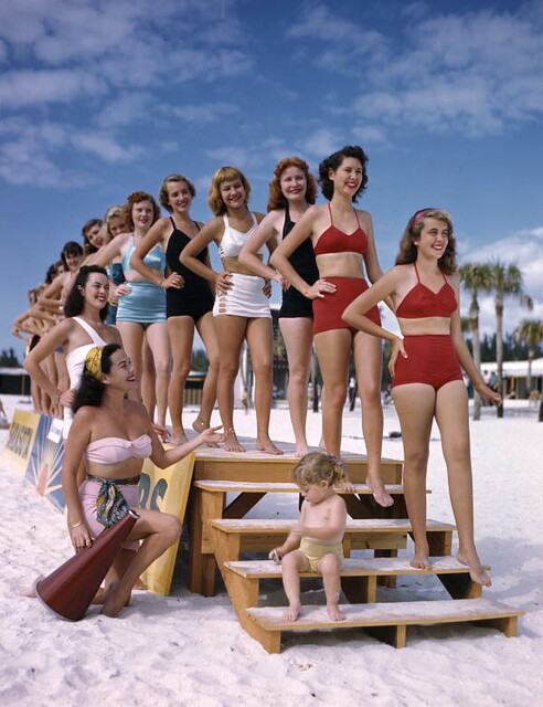 Sarasota Sun-Debs being coached on how to pick up objects on the ground at Lido Beach, Florida