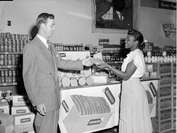 Mr. Higgins hands Armour brand hot dogs to a shopper - Jacksonville