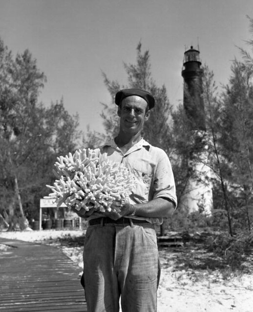 Coast Guardsman holding coral near the Loggerhead Key Lighthouse in the Dry Tortugas