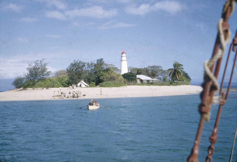Scientists working outside an old shack on Low Island, Queensland, 1954