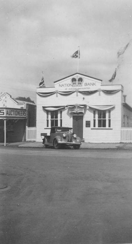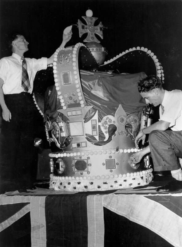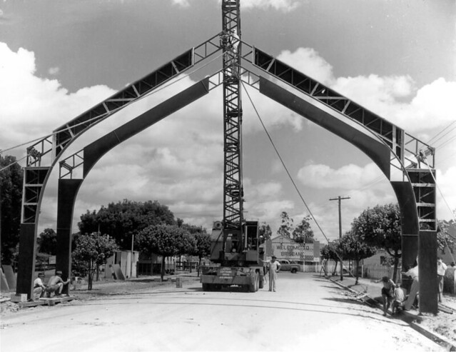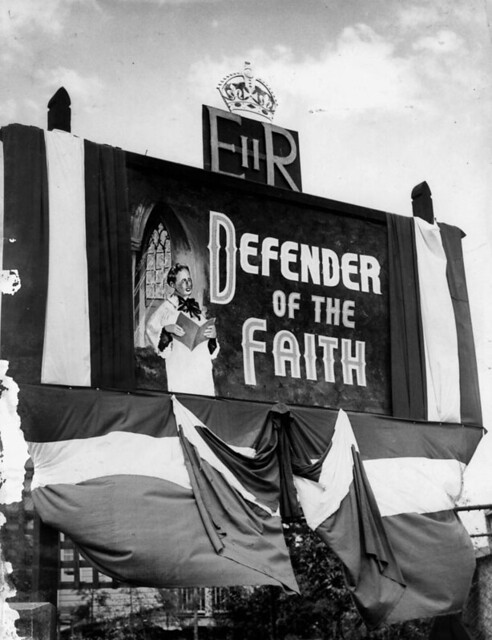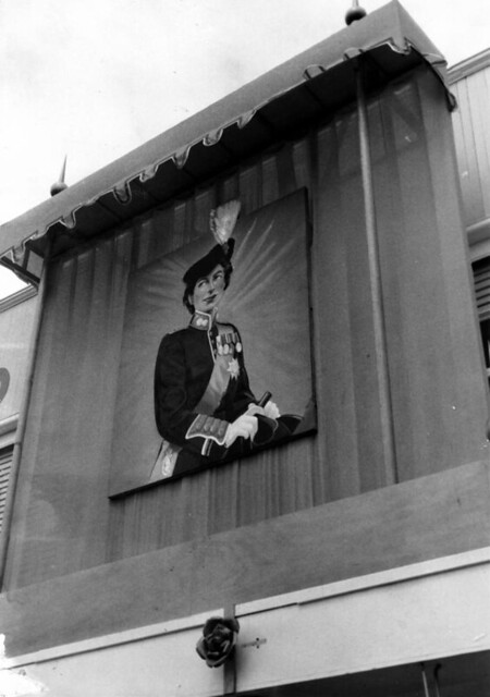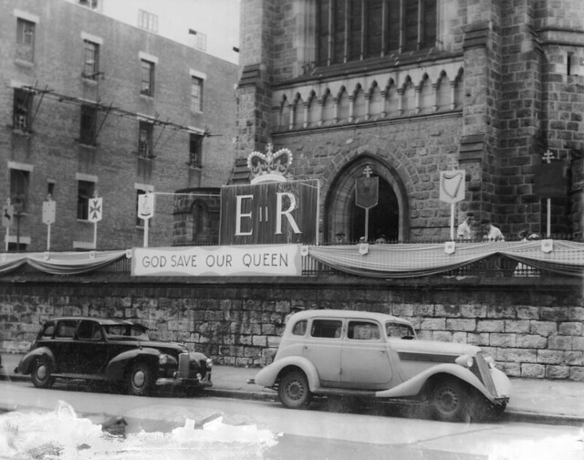 Church decorations in Vulture Street, South Brisbane for the royal visit in 1954