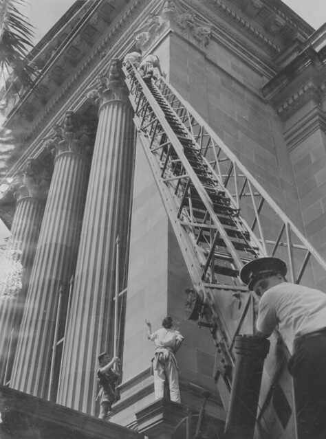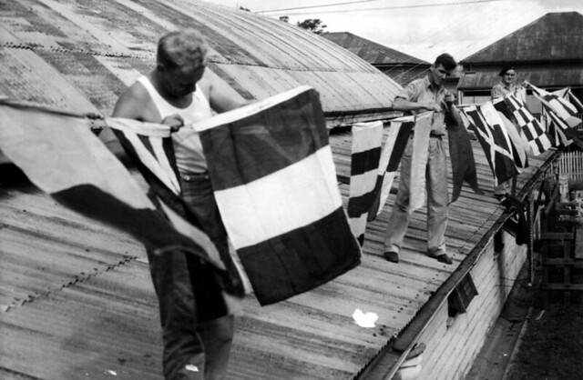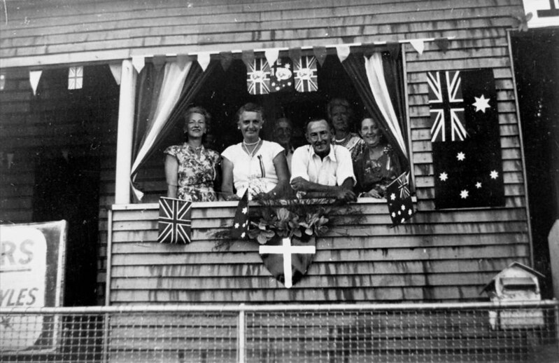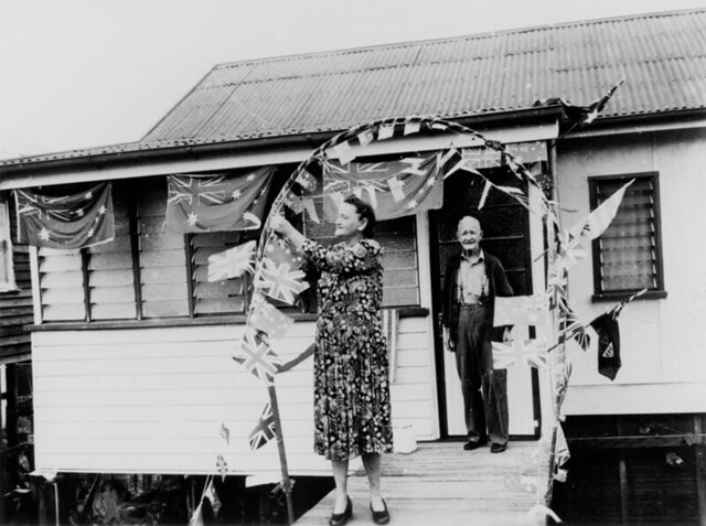 Brisbane residents decorate a cottage in preparation for the Royal Visit, March 1954