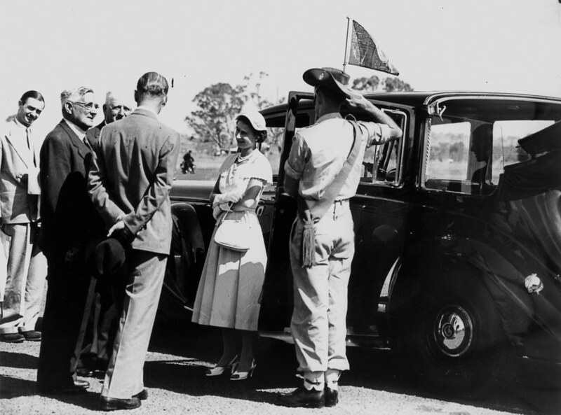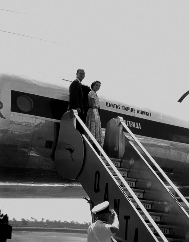 Queen Elizabeth II and Prince Philip arrive at Oakey Airport, 1954