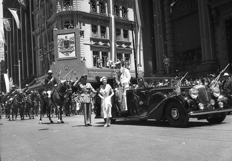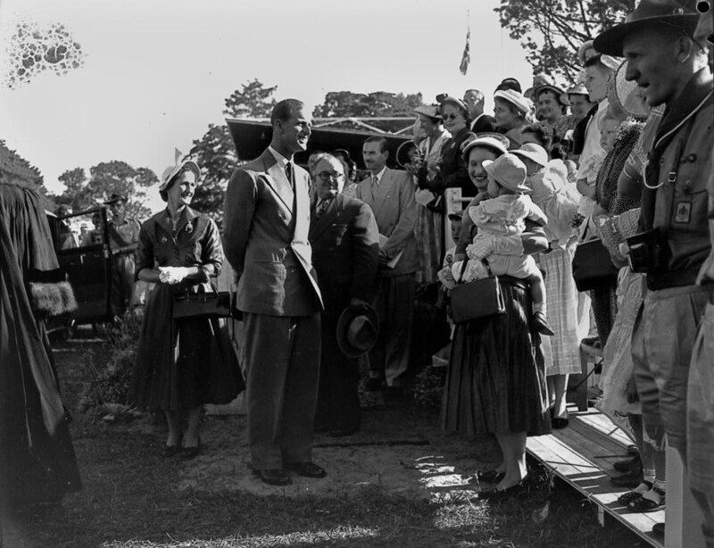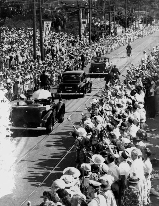 Queen Elizabeth II and Prince Philip en route to Eagle Farm Airport, Brisbane, Queensland, 1954