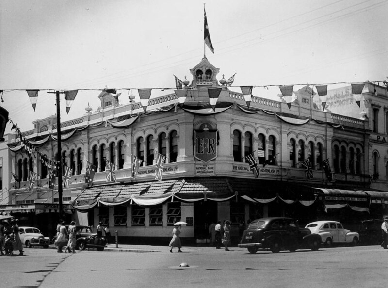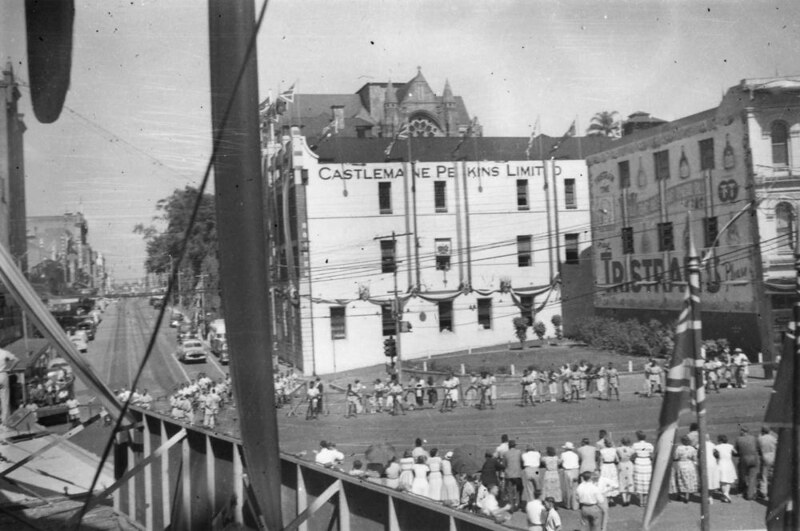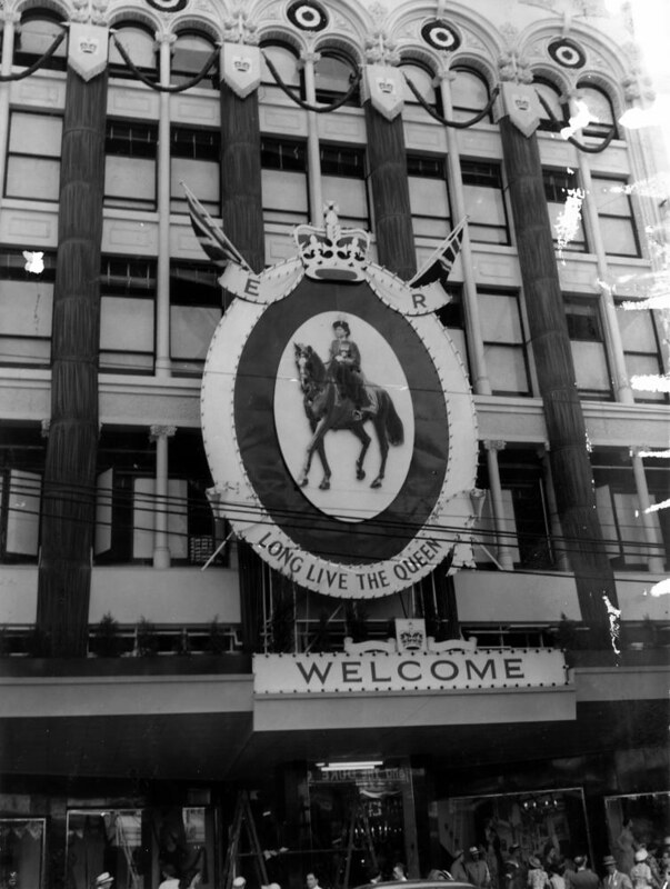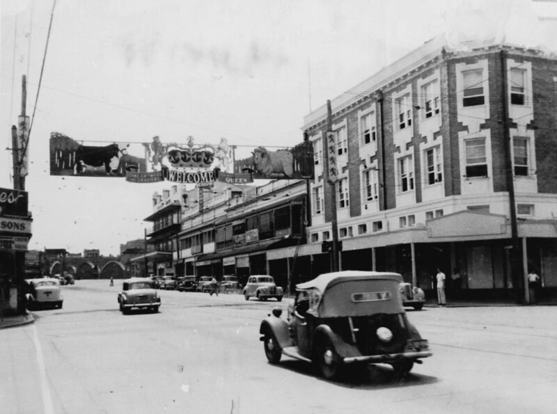 Queen Street, Brisbane, with decorations for the royal visit in 1954