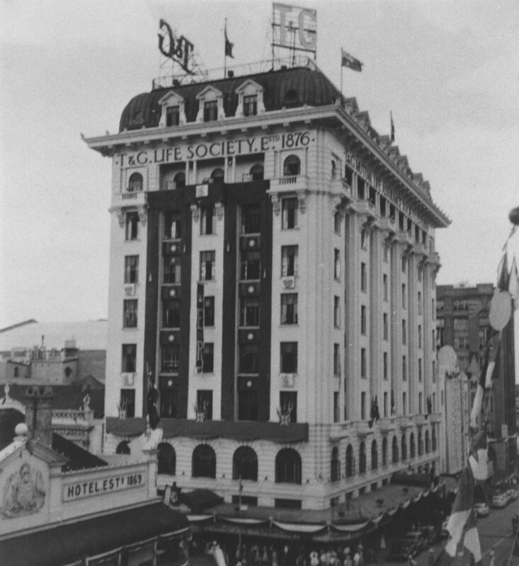 View along Adelaide Street with the buildings decorated for the Royal Visit, 1954