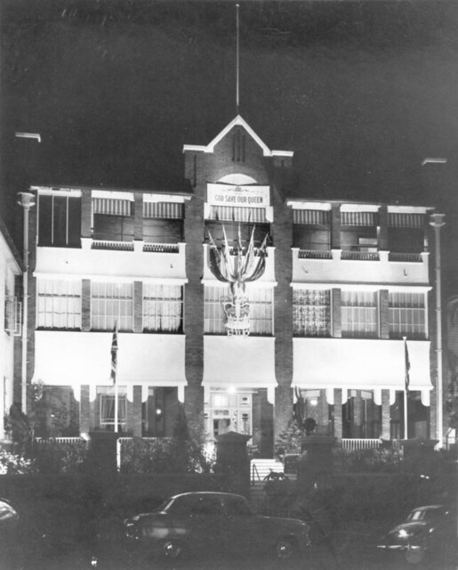 'Belvedere' in Coronation Drive, Brisbane, decorated for The Queen and Prince Philip's visit in March 1954
