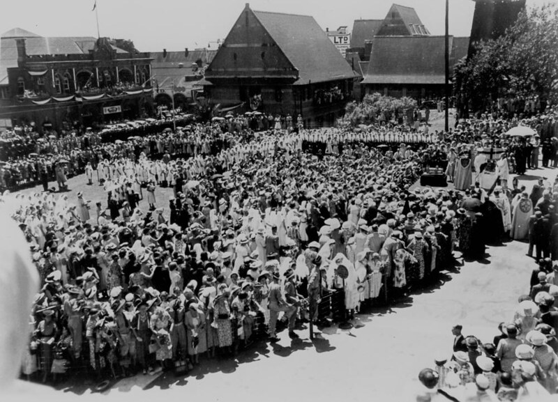 Crowds gather to see Queen Elizabeth II near St. John's Cathedral, Brisbane in 1954