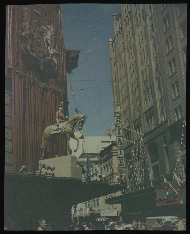 Royal tour decorations, statue of Queen Elizabeth II on horseback, Sydney, 1954 [transparency] /