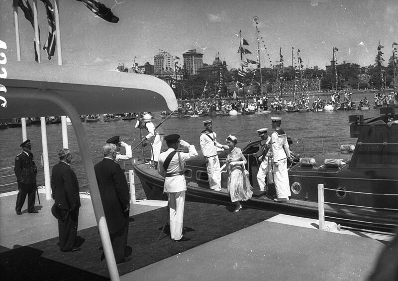 Queen Elizabeth arrives for the Royal Visit, 1954, Farm Cove, Sydney / photographer Jack Hickson