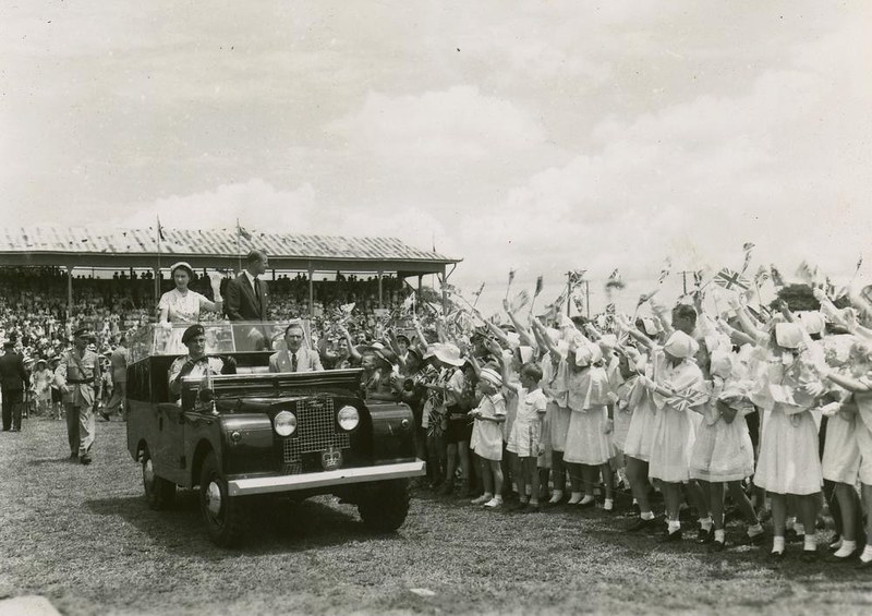 Queen Elizabeth II and Prince Philip in a Land Rover in Mackay, Queensland, 1954