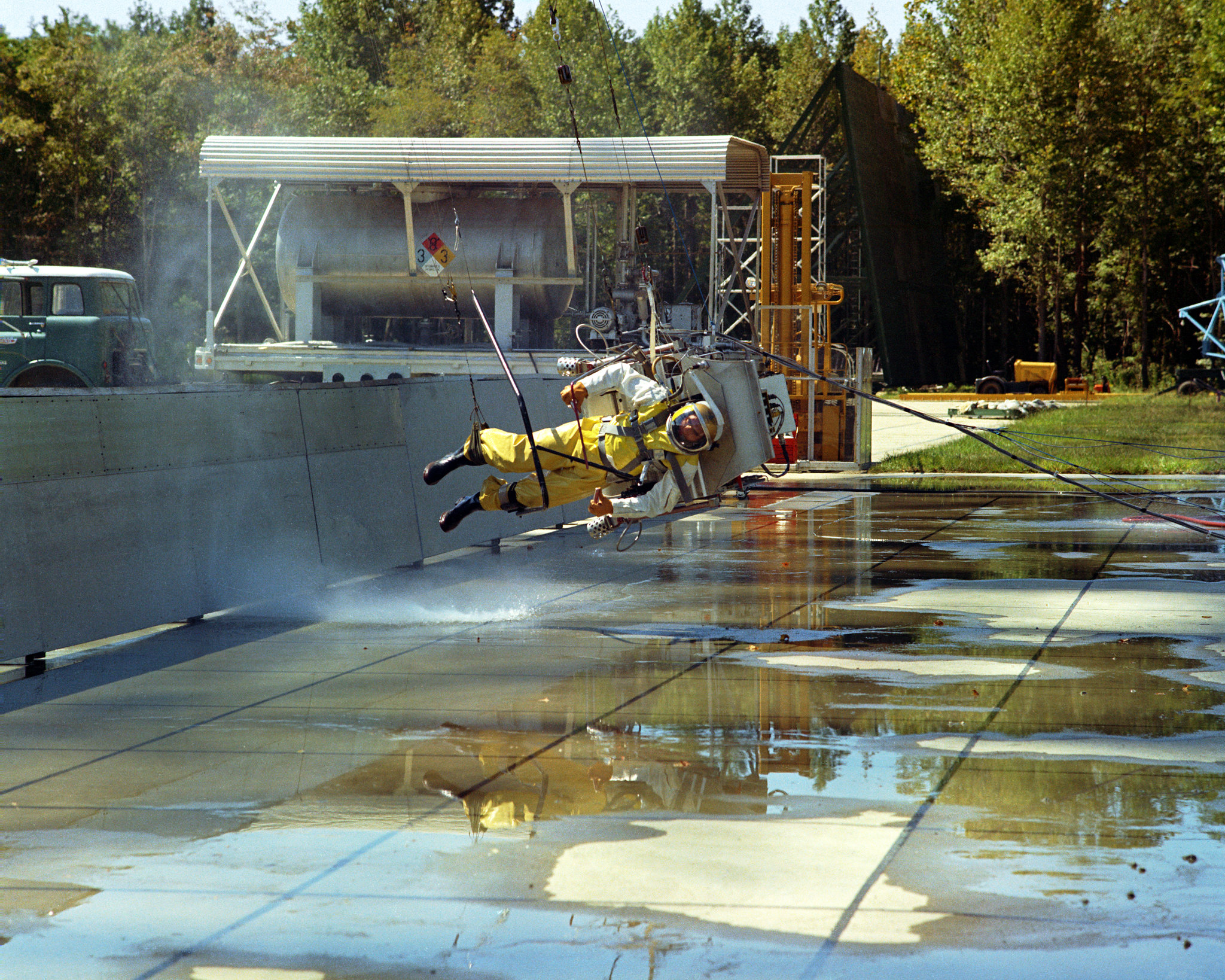 Two astronauts check mobility of different types of Apollo space suits