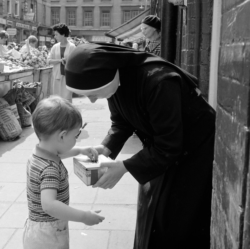 Little boy putting money in nun's collection tray