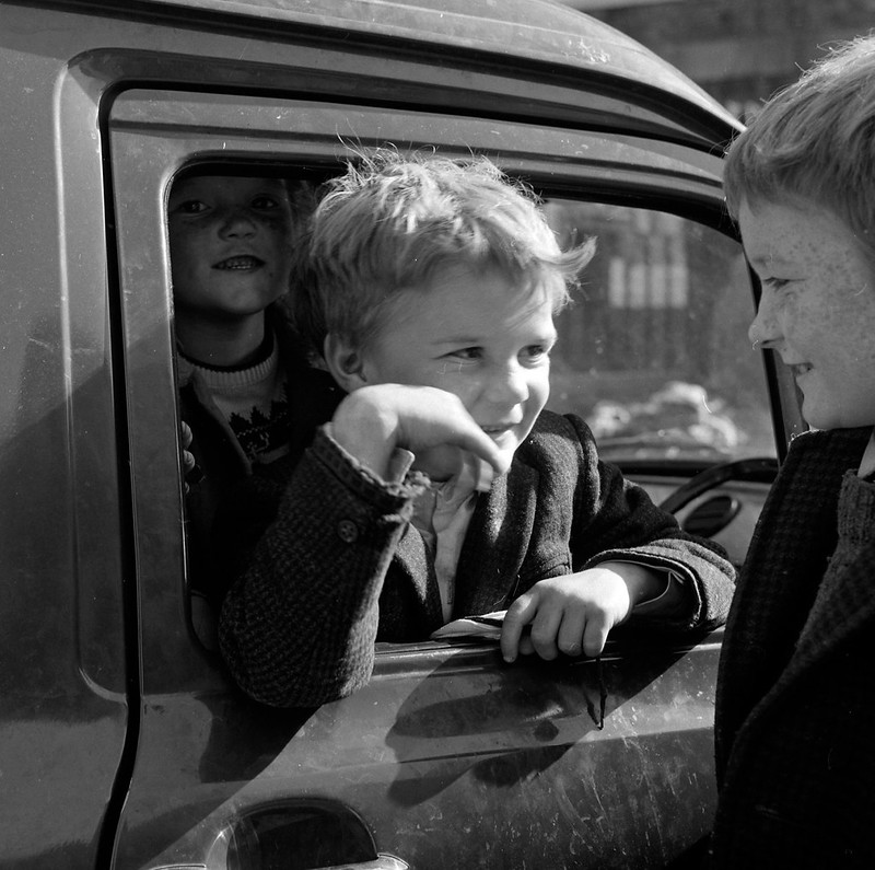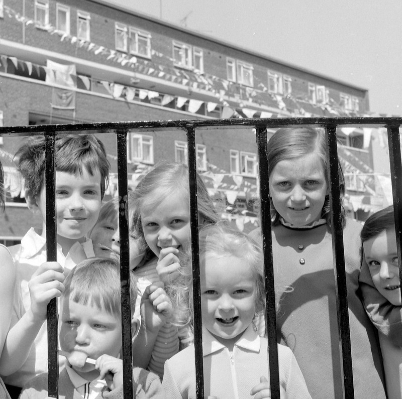 Children near block of flats, Corpus Christi feast-day, Coleraine Street, Dublin