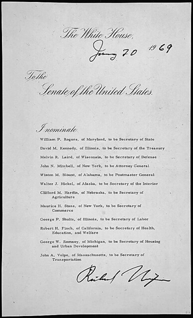 Message of President Richard M. Nixon nominating his cabinet, including William Rogers to be Secretary of State, 01/20/1969