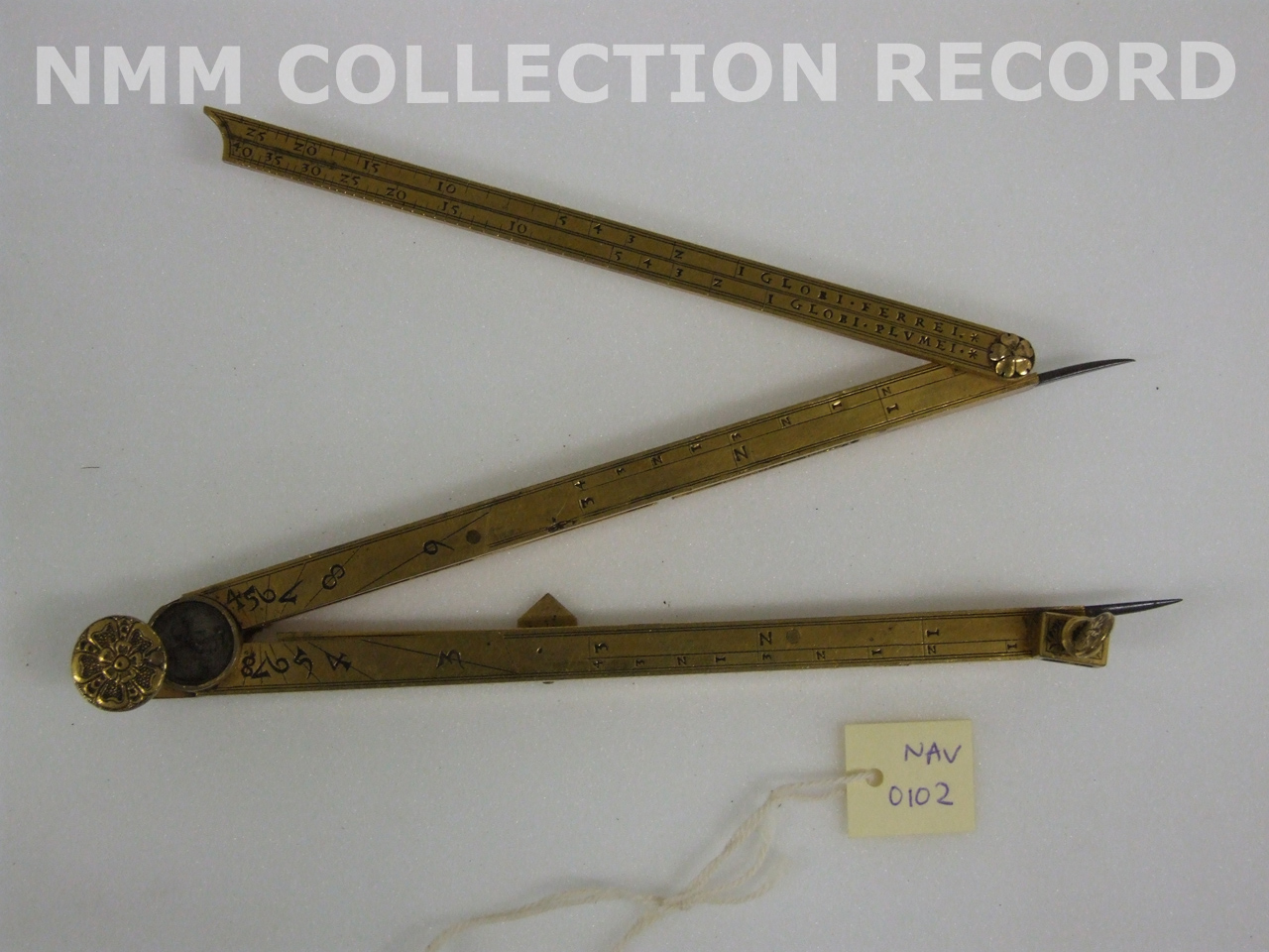 . Computer universal dividers indicating weights of globes of various metals corresponding to measurements of points. Brass gilt with steel points.