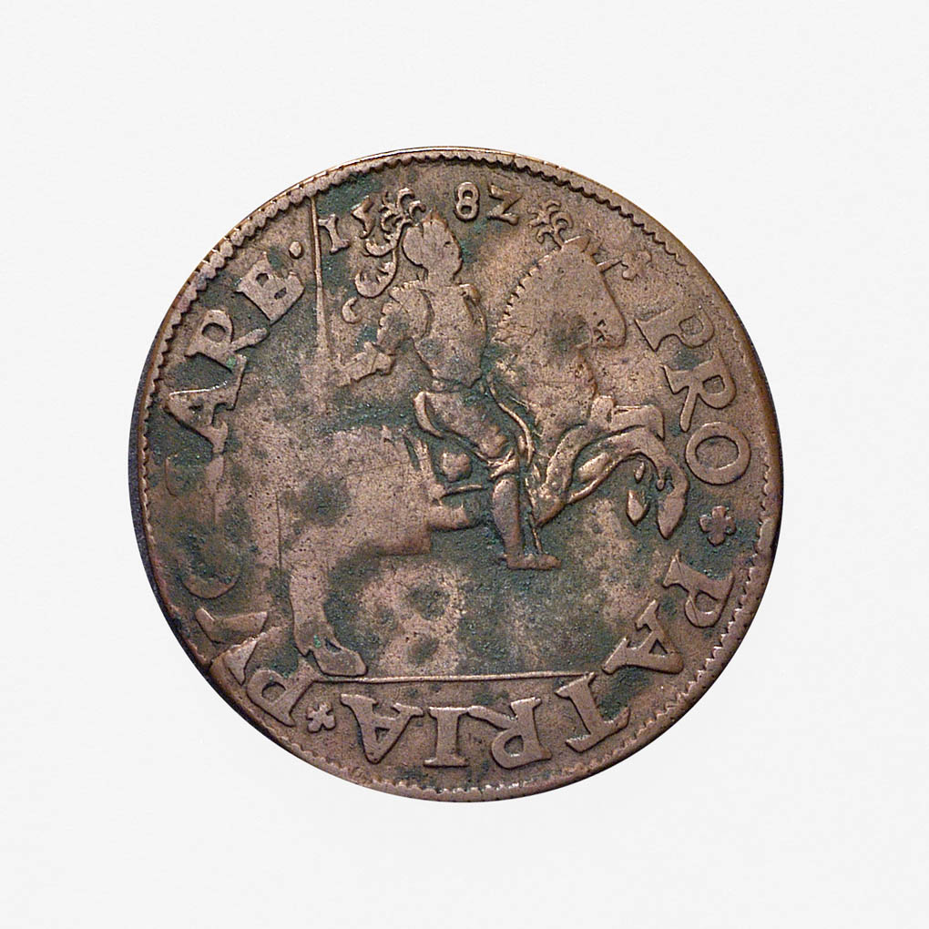 Counter commemorating Admiral Duc de Joyeuse, (1561-1587). Counter commemorating Admiral Anne, Duc de Joyeuse (1561-1587). Obverse: The arms of Admiral the Duc de Joyeuse, coronet above, surrounded by two collars of orders. Legend: 'ANNE . D . D . IO