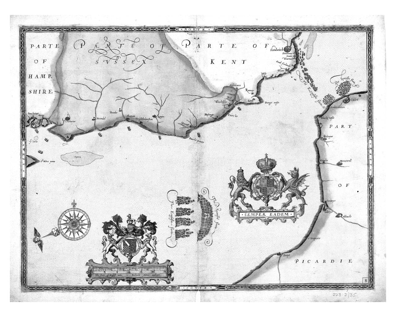 [The pursuit to Calais, 4 - 6 August 1588]. Disbound sheet. Hand coloured engraving. Scale: circa 1:400,000 (bar). Ungraduated chart of the track of the Spanish Armada. The bar scale is in English miles. The chart contains the coats of arms of Queen Eliza